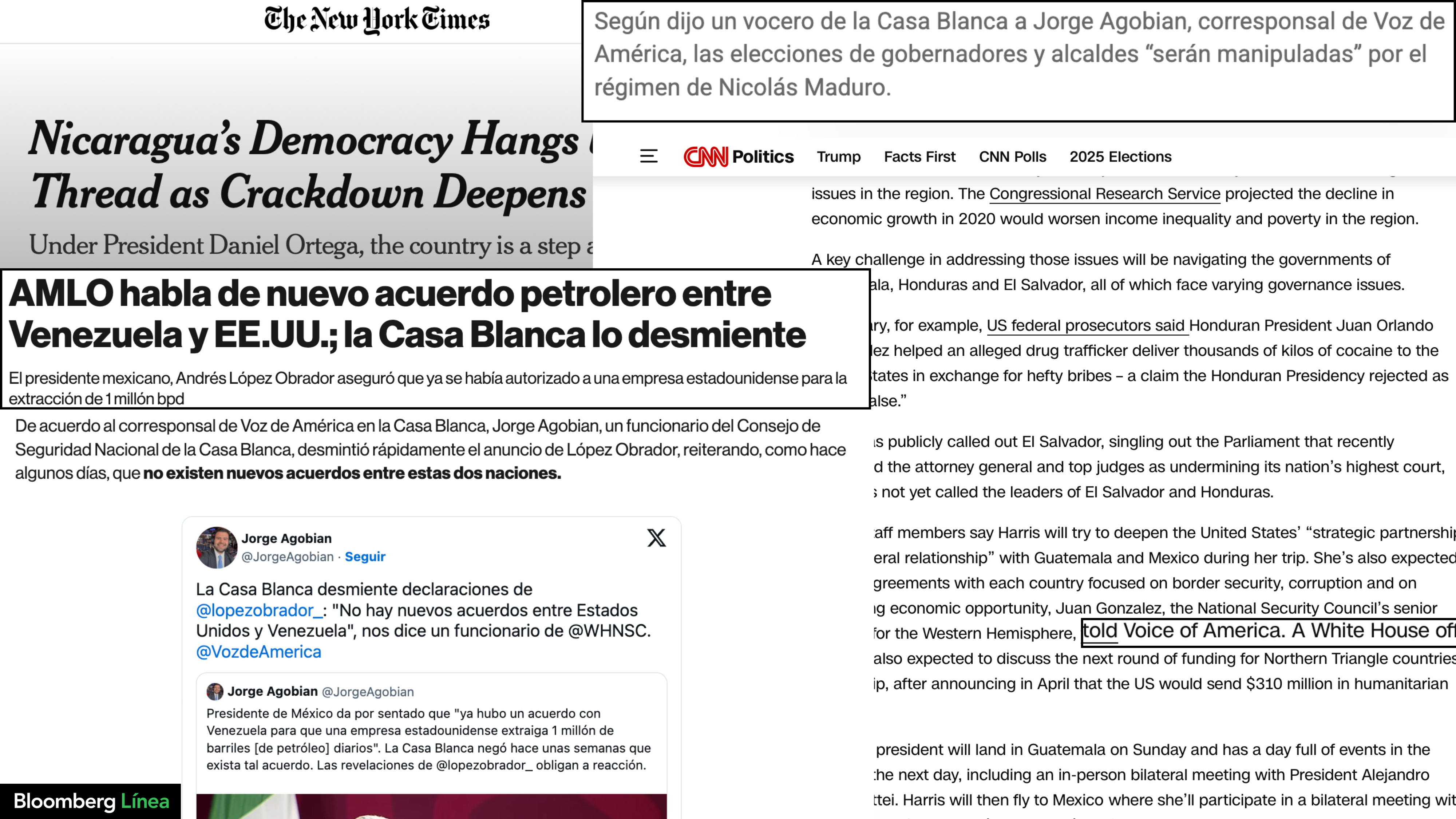 His work has been published in dozens of media outlets and cited by The New York Times, CBS, CNN, Deutsche Welle, Univision, and others. He has reported live for more than 120 radio and television stations across the United States, Latin America, and Spain.